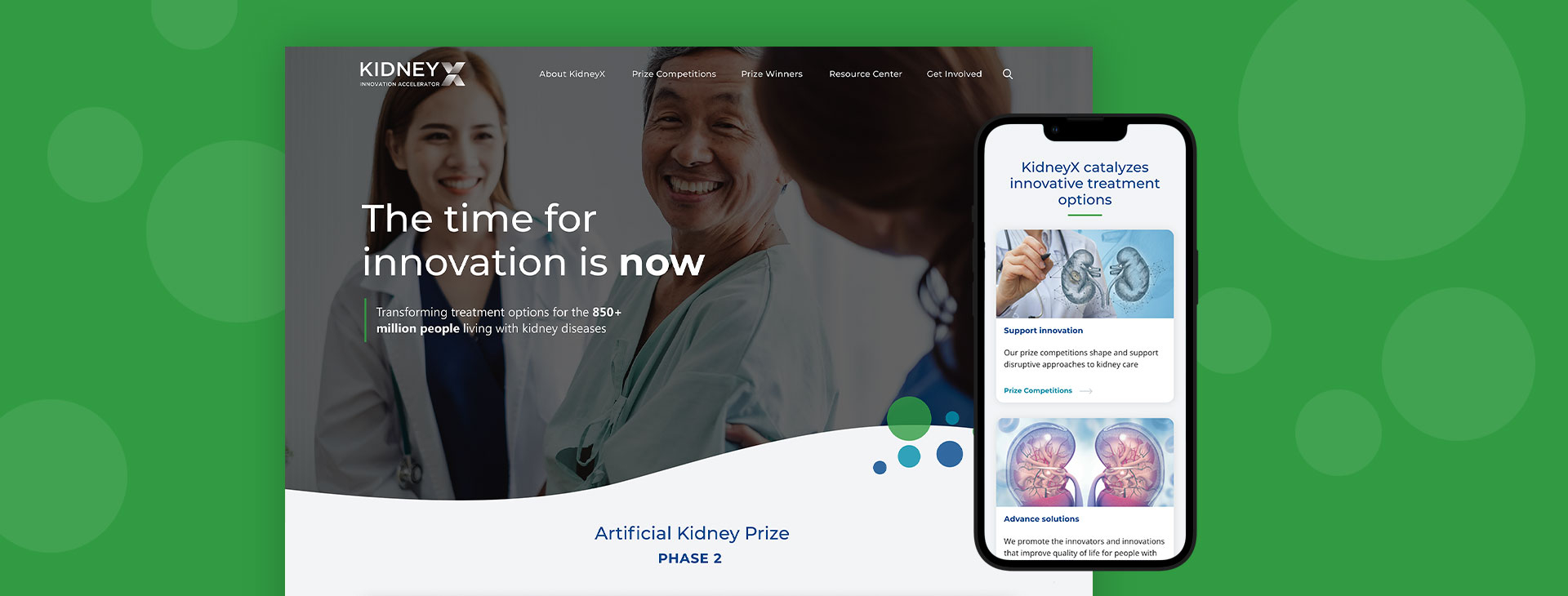 Website redesign for the KidneyX Innovation Accelerator, a public-private partnership between the US Department of Health and Human Services (HHS) and the American Society of Nephrology (ASN) to accelerate innovation in the prevention, diagnosis, and treatment of kidney diseases.