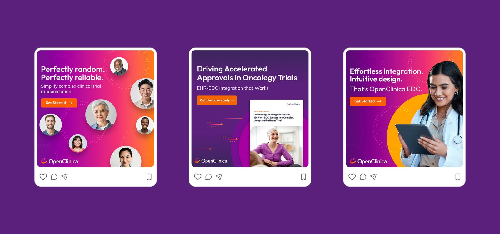 Julian Nicole Design partnered with OpenClinica on a brand refresh that included updating the logo wordmark and icon, refining the color palette, and introducing a more modern visual system. The refreshed identity was applied across marketing and digital channels, creating cohesive, visually impactful campaigns that strengthened the brand’s presence and connection with its audiences.